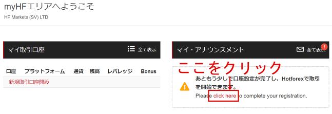 個人情報の入力と本人認証をしないと口座開設出来ませんので、画面の「click here」を押してください。