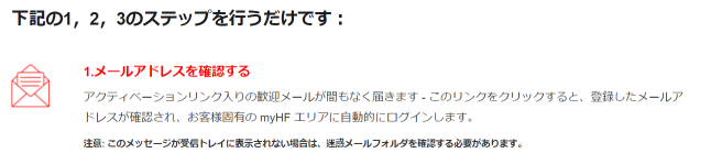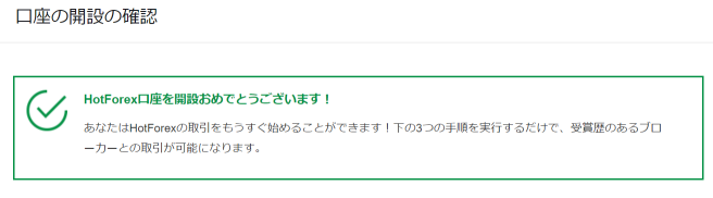 先ほどのHotForexの登録画面での入力を終えて「登録」ボタンを押すと完了画面が表示されます。